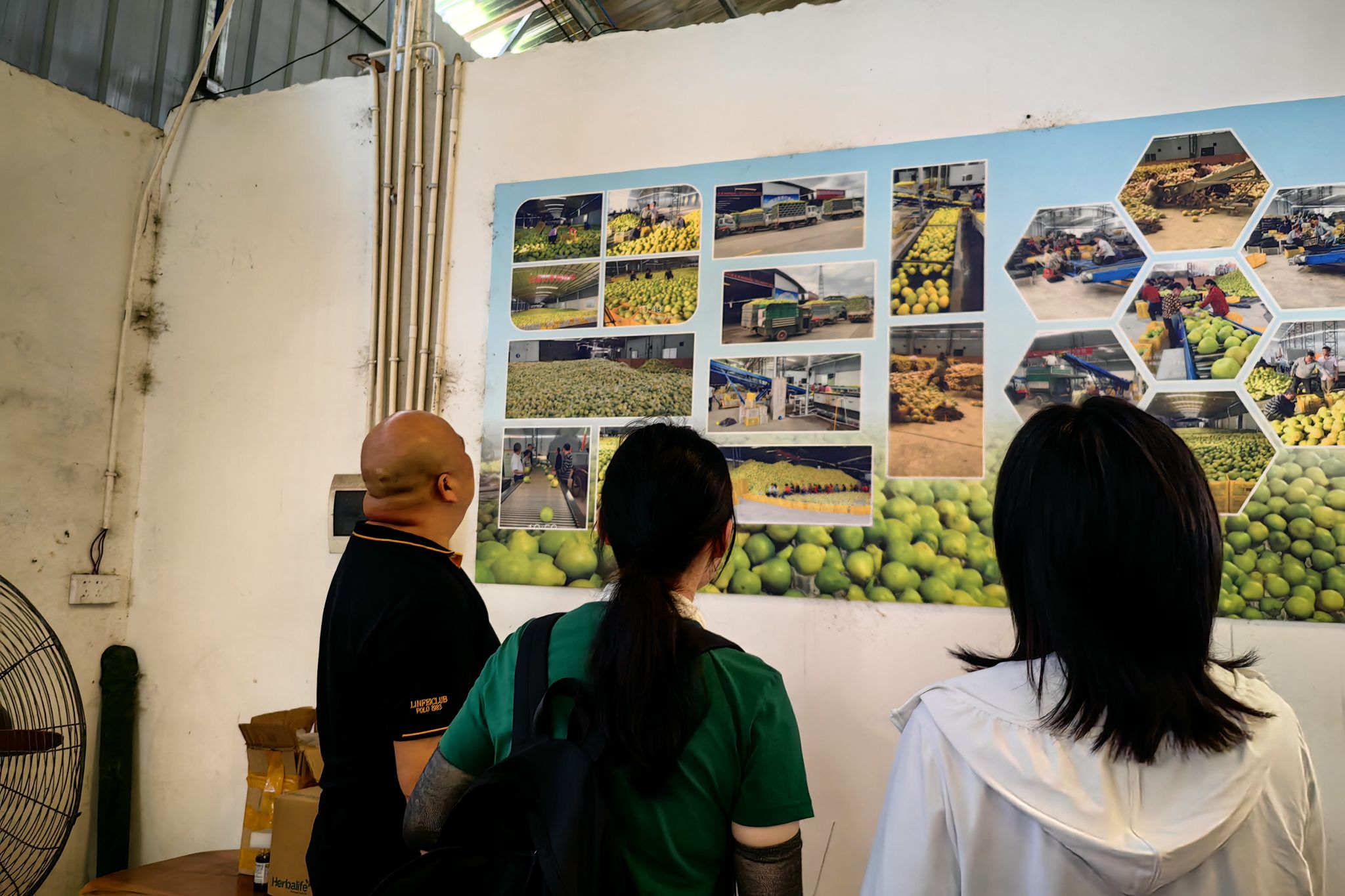 (何辉为实践团成员介绍香柚生产过程及具体步骤)