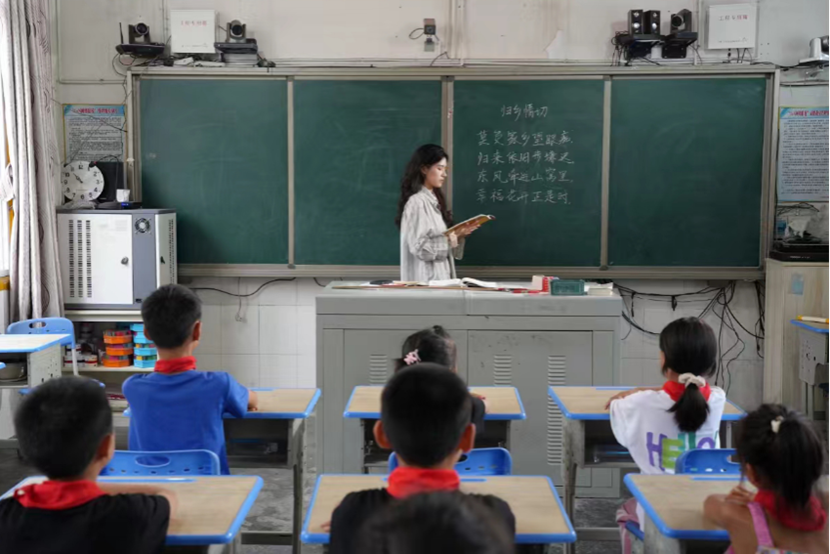 在教学过程中,实践团通过趣味互动如与学生一起坐在葡萄藤下诵读诗词、在乡间小道上了解乡土风光等,让学生在自然风光中掌握朗诵技巧,提高其对于乡土文化与特色诗词的学习兴趣和参与度,帮助学生在田野与课堂中更好实现良性互动与迭代成长。
