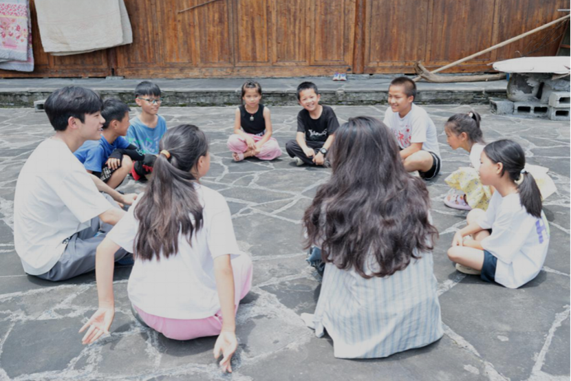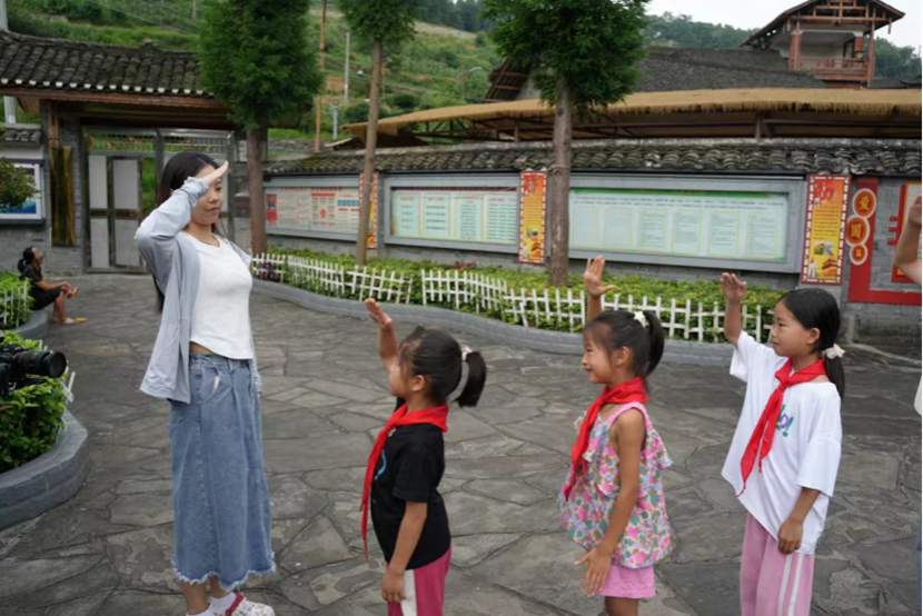 同时,实践团与学生围成圆形团坐于地,通过讲述特色乡土故事与讲解敬礼正确姿势细节,增强学生乡村振兴的责任感和使命感,激发对乡土文化的兴趣和认同感。