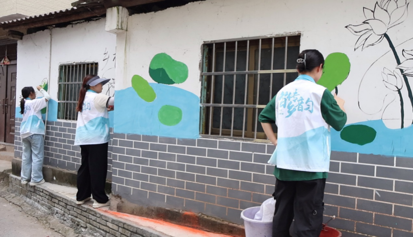 墙绘工作启动后,实践团成员们开始在空墙上勾勒线稿。这一过程吸引了许多过路的村民的围观,村民们希望墙绘能更好地融入地方特色与情感。实践团成员们将村民的建议作为优化墙绘设计的重要参考依据,完成了契合岩板铺村特色的线稿工作。