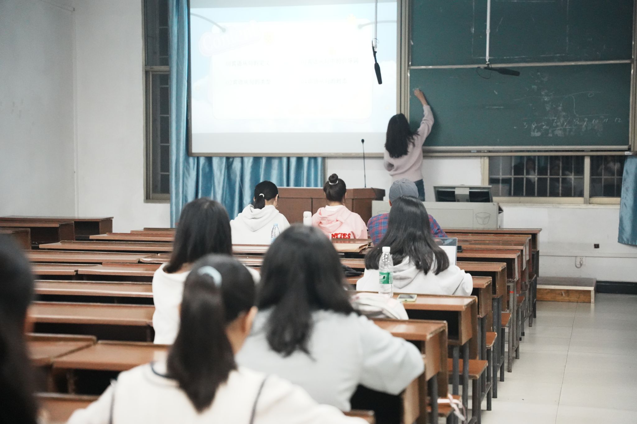九位选手依次上台,在十分钟内,采用板书与ppt结合的方式,讲解了自选的课程内容。选手们的课程选题丰富,涵盖古诗古文、政治地理、语音朗读,并在讲解中将自身代入具体情境,为在场观众呈现了一场场强互动性的微课堂。
