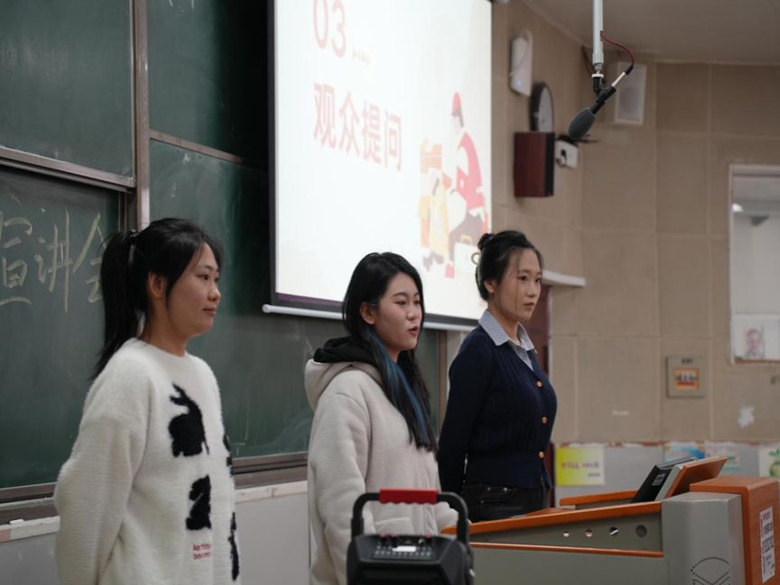 三位主讲人结合自身志愿活动经历向2024级新生们介绍我院的特色志愿活动项目。在现场提问环节,观众互相讨论,三位主讲人对如何参与到学院的志愿活动、如何在大学期间做好一名优秀的志愿者等问题进行解答,呼吁学生发挥自身作用,从小事做起,不断累积,为志愿活动贡献力量。呼吁学生发挥自身作用,从小事做起,不断累积,为志愿活动贡献力量。