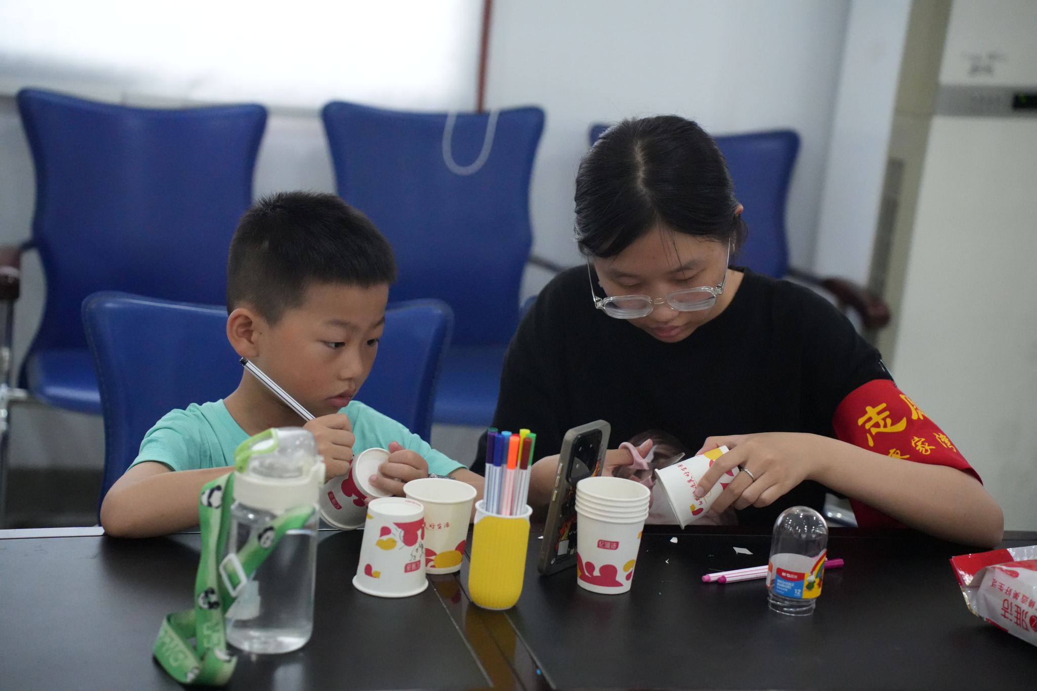 在志愿者的指导下,孩子们通过不同材料进行手工实践:使用纸杯制作多种造型的"情绪怪兽",运用粘土塑造笑脸模型,并利用卡纸制作皮卡丘造型手环。这些手工制品体现了儿童对情绪认知的具体表达,展示了他们在手工制作过程中表现出的想象力与创造力。