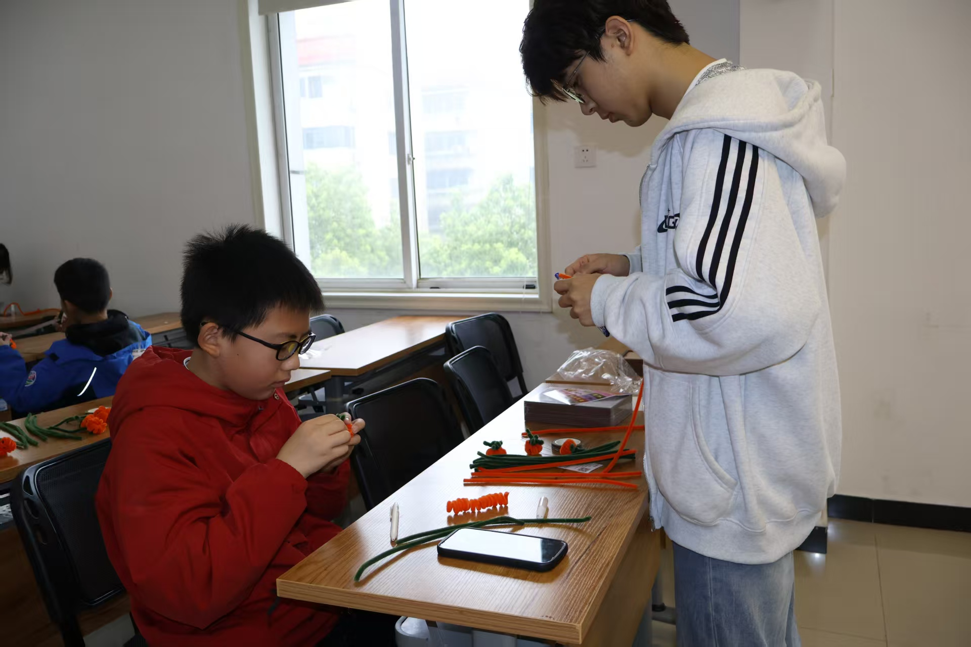 理论科普结束后,志愿者为孩子们分发扭扭棒、相框底座、胶带等材料,耐心示范制作步骤,手把手进行指导并针对孩子们在缠绕、拼接中遇到的问题及时帮忙调整。在志愿者的细心协助下,一个个形态各异、寓意美好的柿柿如意相框逐渐成型,孩子们体验到了手工创作的乐趣,理解了“变废为宝”的环保意义,同时也从“柿柿如意”的美好寓意中感受到了传统文化的魅力。