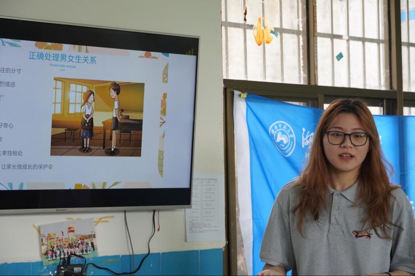 本次的教学活动对男女生分别进行教学,男生组教学由唐博闻负责,女生由陈言晴、汪仕祺负责。教学活动主要分为三个板块,一是介绍男女生青春期的生理变化,着重介绍了女生月经相关知识及生理期注意事项。二是对男女生进行青春期的心理教育。最后组织主题绘画课,让学生自由畅想画出青春自画像,考查学生青春期审美认知水平。