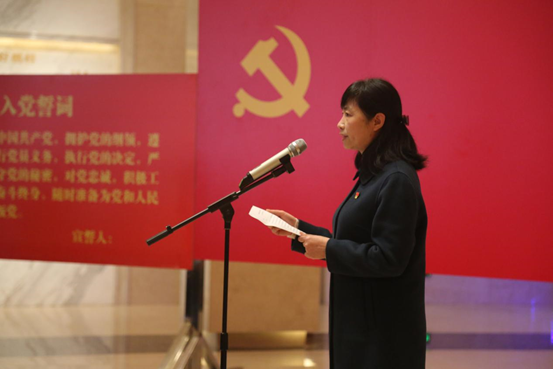 57名新党员在鲜红的党旗前庄严宣誓,张小春领誓,其他党员重温入党誓词。