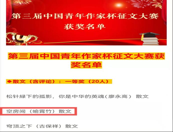 近日,由“青年作家网”组织发起的第三届中国青年作家杯征文大赛公布获奖名单,我院2020级新闻学专业喻霄竹同学凭借其作品《空房间》获得散文类一等奖