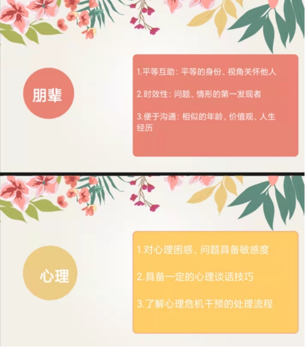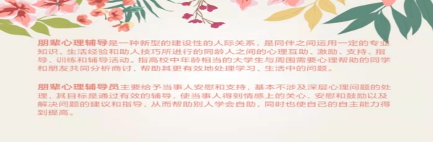 旨在明确朋辈心理辅导员的定位,发挥其在特殊时期稳定同学情绪、营造积极向上的学习生活氛围的作用,并提高及时关注大家的心理状况、解疑释难的意识和能力。