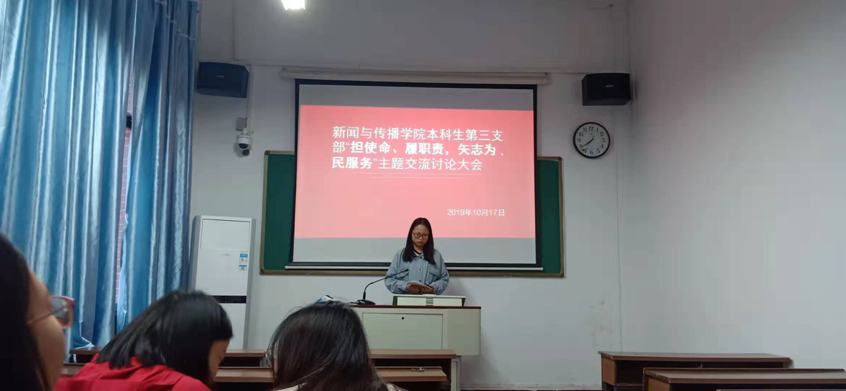 大会第一项,由各党小组代表发言,交流他们所理解的“担使命、履职责,矢志为民服务”。新闻小组的施敏同学谈到:“在担使命上,我们要有敢于勇挑重担、敢于攻坚克难的勇气和信念,发挥共产党人不畏艰难的勇气。在履职责上,共产党人要明晰自己的职责所在。”新媒小组的刘晓庆谈到:“作为一名共产党员,我们一定要坚定信念,牢记中国共产党人的初心和使命,为中国人民谋幸福,为中华民族谋复兴。牢记党的宗旨,全心全意为人民服务。”广电小组的李甜甜谈到:“作为大学生,最重要的就是学好专业的知识技能,培养积极正确的世界观、人生观、价值观。我们应该锤炼刚正坚毅的品格,全心全意为人民服务,共筑伟大的中国梦。”新实小组的张江汀谈到:“进入新时代,担使命被赋予了新的时代内涵。面对当前复杂的国内外形势,我们尤其需要以高度的思想自觉、政治自觉和行动自觉来担使命履职责。”