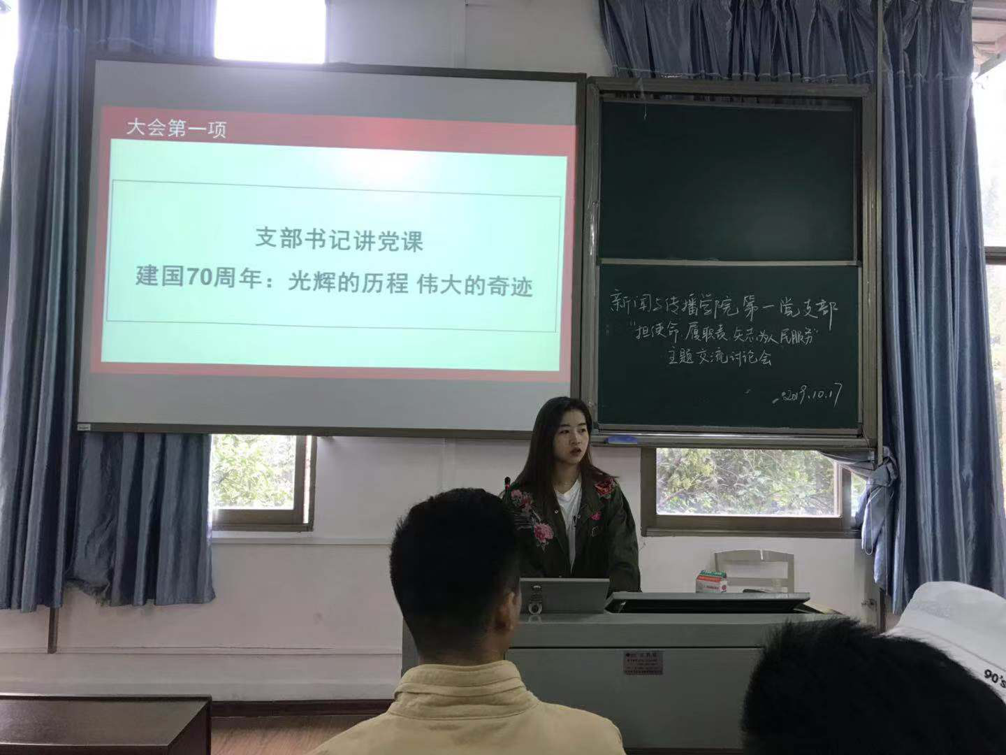 本次主题教育大会共分为三个流程。首先到场党员集体听取支部老师的教育与发言。书记强调要准确把握主题讨论目标要求七十年,是一棵幼菌,长成参天大树的时间;七十年,是一个稚子,成为国家栋梁的时间;七十年,是一个国家,完成辉煌蜕变的时间。今年,是全面建成小康社会的关键之年,也是新中国成立70周年。七十年卧薪尝胆,中华民族挺起了脊梁:七十年奋发图强,中华儿女谱写了诗章;七十年砥砺前行,神州大地丰收了硕果;七十年携手井进,中国梦播下了希望。今天讲述分为四个章节,沧桑巨变70年;70年来的光辉历程;70年来的伟大奇迹;70年来的历史启示。沧桑巨变70年 70年砥砺奋进,70年春华秋实。中华人民共和国成立以来的70年,是不断创造伟大奇迹、彻底改变中华民族前途命运的70年。 在人类历史长河中,70年弹指一挥间。1840年鸦片战争后的100多年里,中国频遭侵略和蹂躏之害、饱受战祸和动乱之苦。新中国成立以来的70年彻底改变了中华民族的前途命运,使中华民族走向伟大复兴。 70年,中国创造的奇迹有很多。这一个个奇迹极大改变了中国的面貌、中华民族的面貌、中国人民的面貌、中国共产党的面貌,汇聚成实现中华民族伟大复兴的盛大景象。 历史是最好的教科书。回望新中国70年不平凡的历程,我们能得到许多宝贵的历史启示,引导我们开启更为光辉的历程、创造更为伟大的奇迹。最后支部成员展开主题交流讨论,支部成员耿世明表示,正如习近平总书记在党的十九大报告中指出,中国共产党人的初心和使命,就是为中国人民谋幸福,为中华民族谋复兴,我们作为新时代的党员要有担当、要实干。