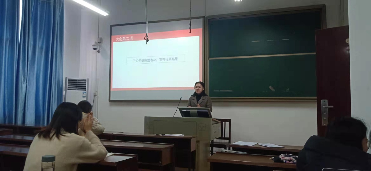 会议严格按照党组织预备党员转正程序,共由五部分组成。首先预备党员向党组织汇报自身对党的认识、入党动机、个人经历以及在校表现等;随后由支部副书记何梦婷宣读入党介绍人培养考察意见;支部副书记何梦婷同志向大会报告各位发展对象现实表现的考察情况以及综合政治审查情况;与会党员对发展对象是否符合党员条件发表了意见;大会成员进行讨论,大会认为,甘婷、张江汀、李甜甜等12名同志符合党员条件,经与会正式党员投票表决,大会一致同意甘婷、张江汀、李甜甜等12名同志按期转正成为中共正式党员。